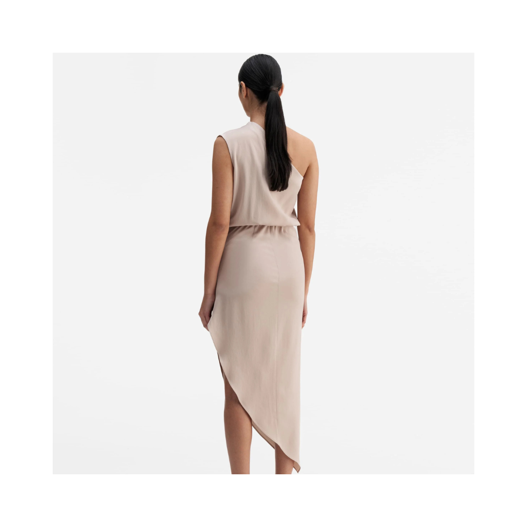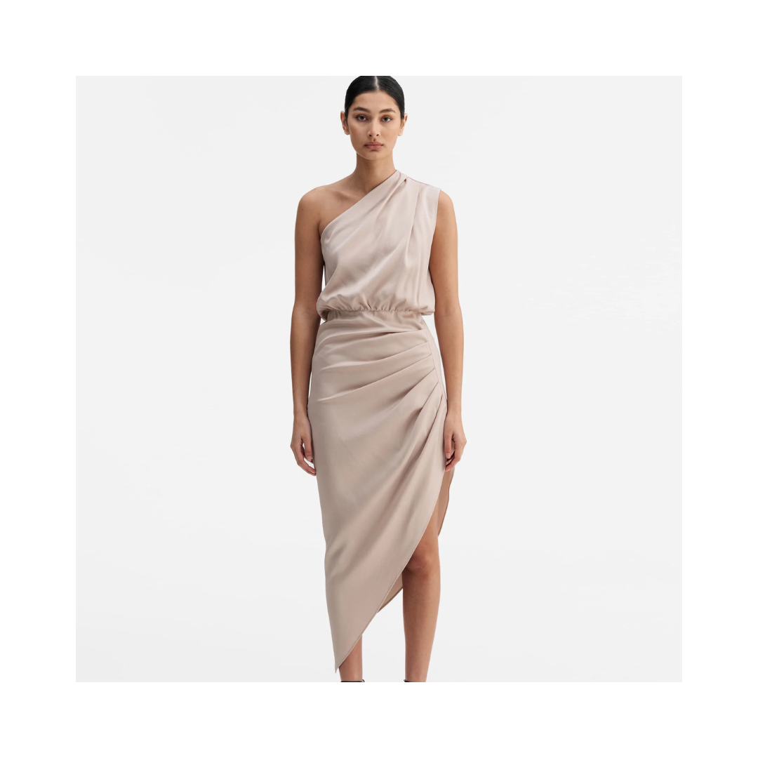 Elle-klänningen är tillverkad av en acetatblandning med en strukturerad yta och har Ahlvars signaturveck som draperar längs ena axeln. Kjolen har en hög slits och placerade veck som draperar.
