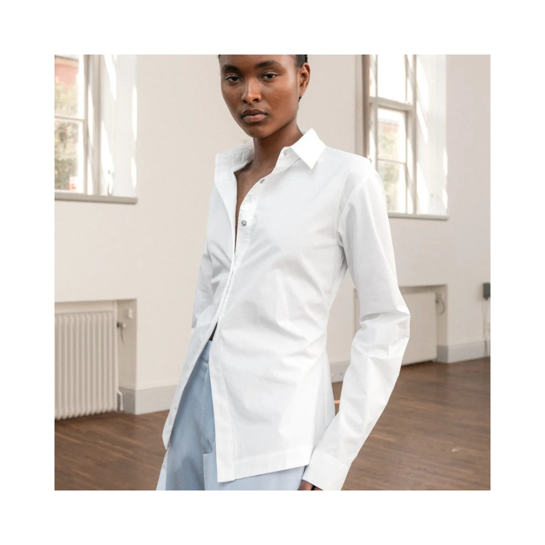 Leia-skjortan är tillverkad av bomullspoplin och har insnitt längs kroppen för en elegant, smal passform. Ärmarna avslutas med klassiska skjortmanschetter med slits och knappar. Kombinera med vilken nederdel som helst för en vardaglig outfit.