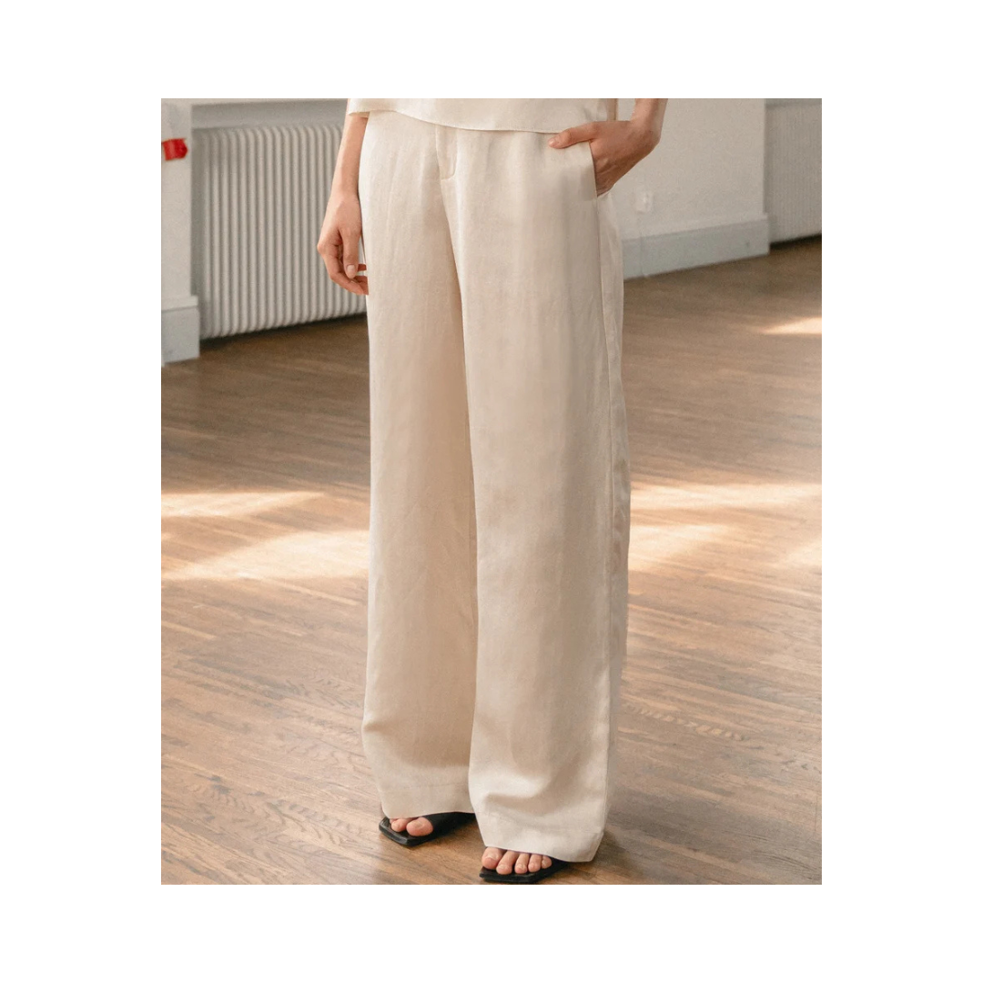Mila linnebyxorna är gjorda av en acetat-/linneblandning med en satinyta som sitter högt i midjan och raka och lätt avslappnade ben. De har fickor i sidsömmen, gylf, dold tryckknapp och bälteshällor i midjan. Kombinera med en topp från Ahlvar för en komplett look!