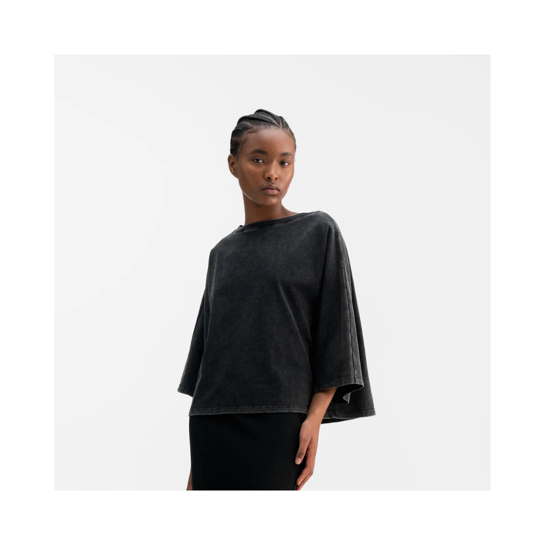 Thea jersey-tröjan är gjord av ett tvättat bomullsjerseytyg och har en överdimensionerad och avslappnad silhuett med pingvinärmar och en snygg kant runt båthalsringningen. Kombinera med vilken som helst av våra sidenbyxor för att göra din outfit mer rörig och lekfull.