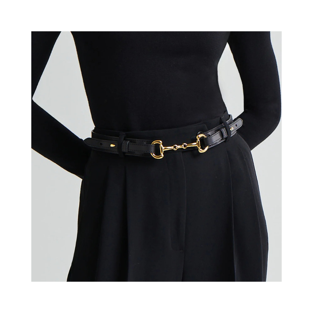 Ett svart läderbälte med ett raffinerat guldfärgat metallspänne. Rent och polerat, det ger en elegant accent till klänningar, skrädderi eller vardagliga looks.