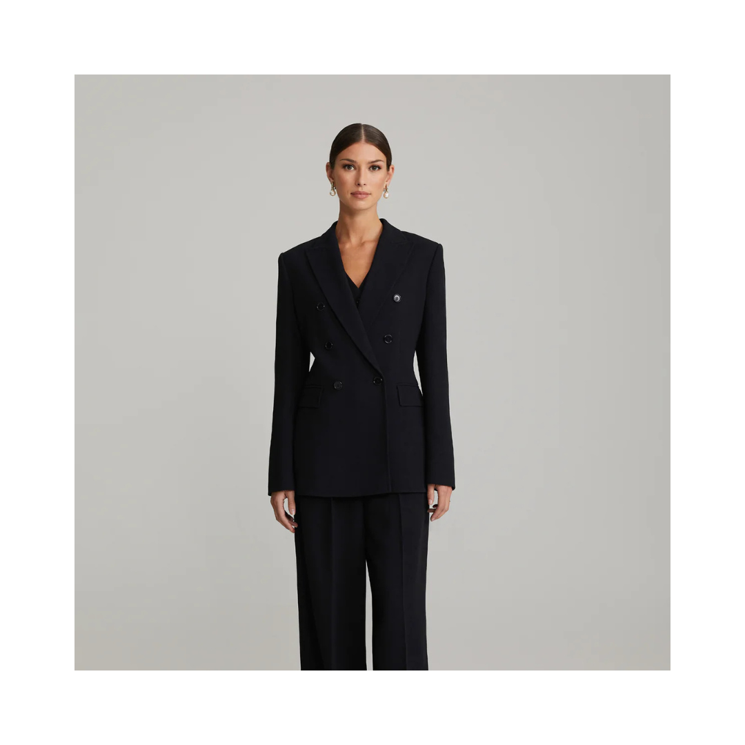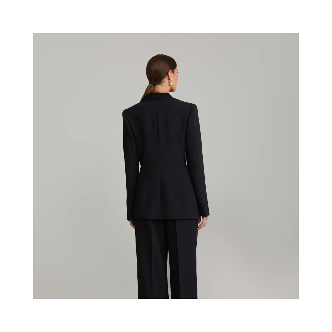 Dubbelknäppt kavaj med avslappnad passform, fickor med lock, knappar i ärmsluten och dekoration med handgjorda sömmar på kragen. Kavajen är fodrad.