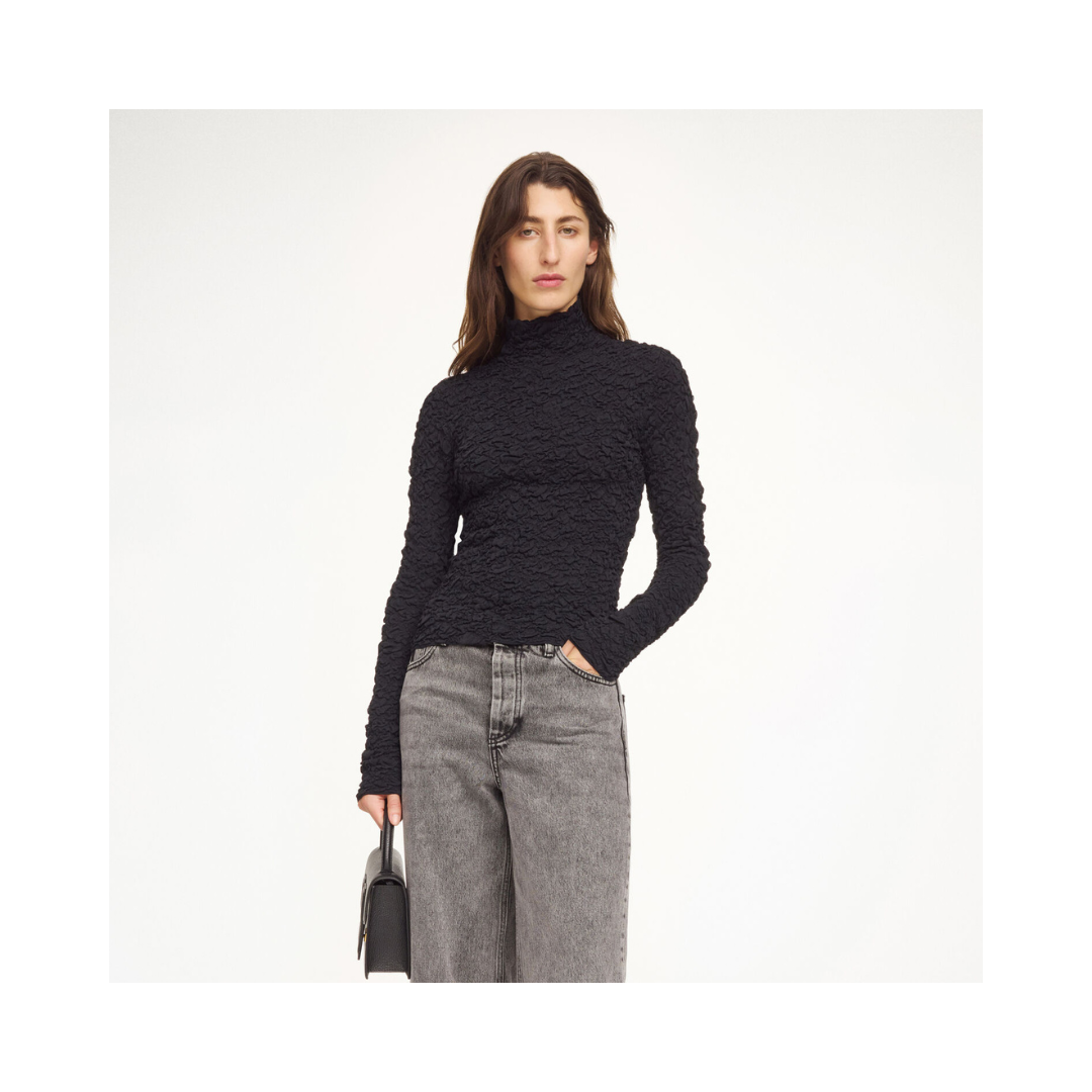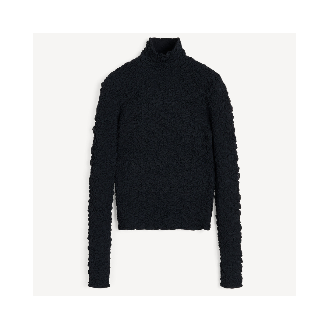 Aura-blusen fungerar både för jobbet och efter jobbet. Det stretchiga, taktila tyget framhäver den snäva silhuetten med polotröja och långa ärmar. Bär den med skräddarsydda byxor eller minikjolar.a