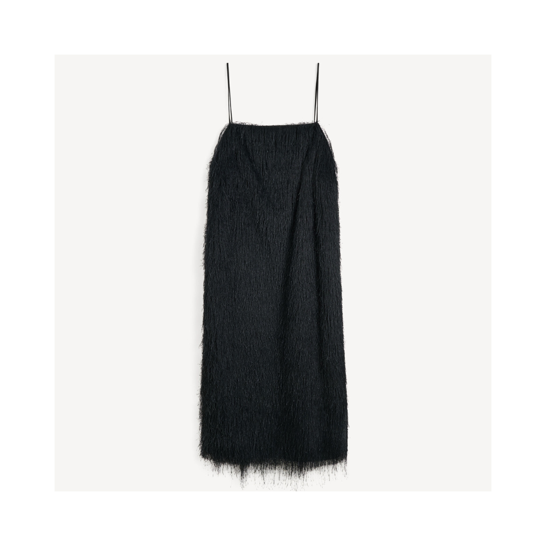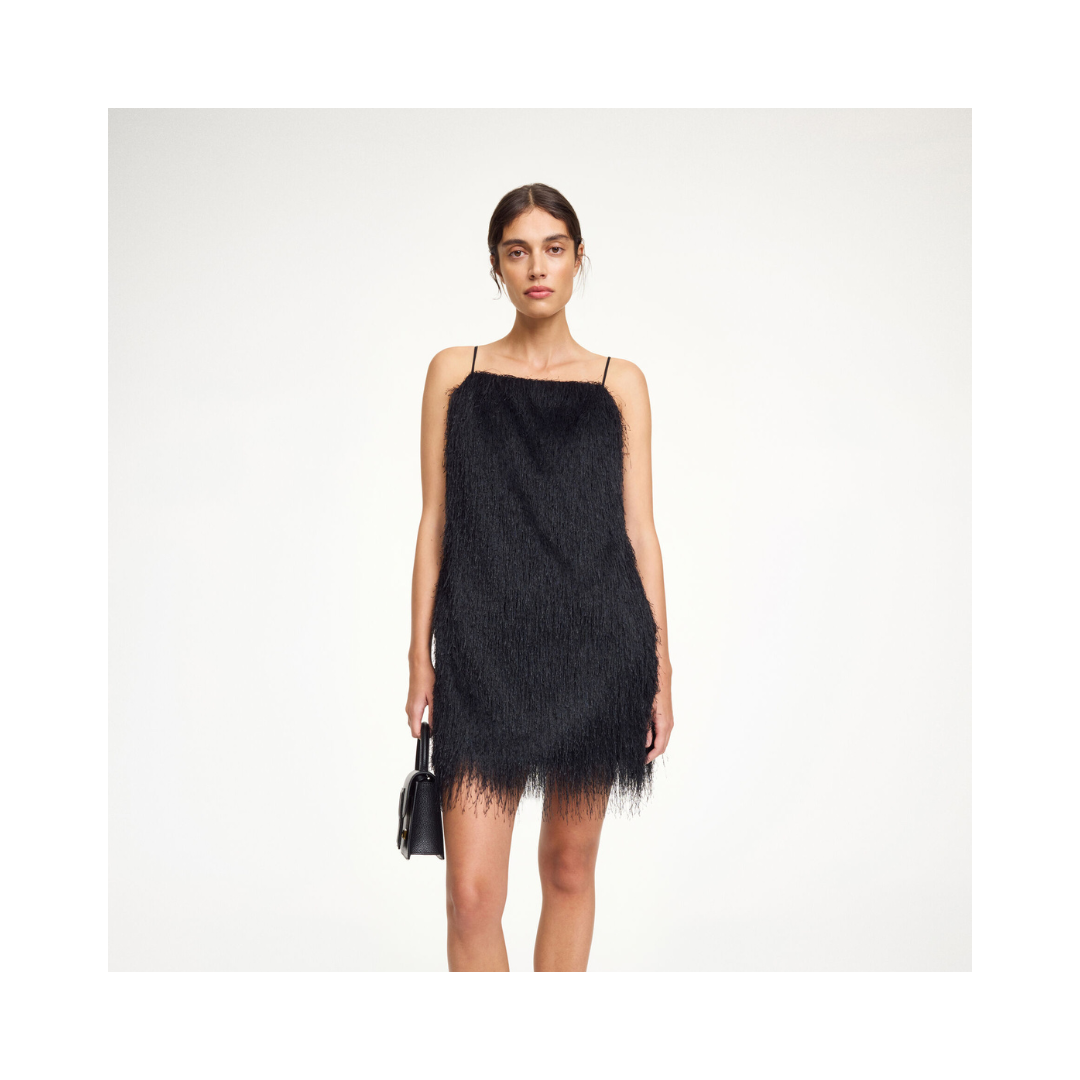 Ledo-klänningen är eklektisk med en touch av dramatik och är designad för eftermiddagsbruk. Den helfodrade mini-designen har en minimalistisk silhuett med rak halsringning och är täckt av långvariga fransar som svajar när du går. Bär den ensam med ett par låga klackar eller över en vit skjorta.
