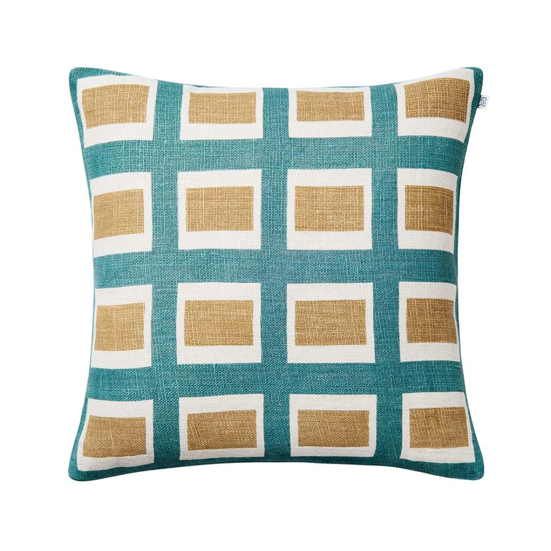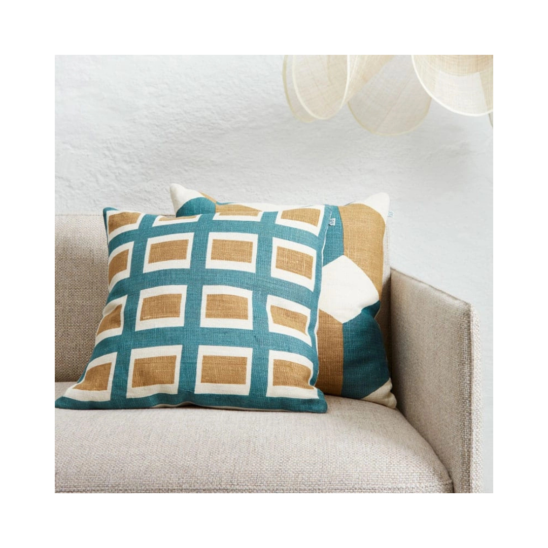 Kuddfodralet Hira har ett geometriskt mönster som handtrycks på linnetyg. Mixa och matcha med mönstrade och enfärgade kuddar i linne eller bomullsbouclé. Enfärgad baksida.
