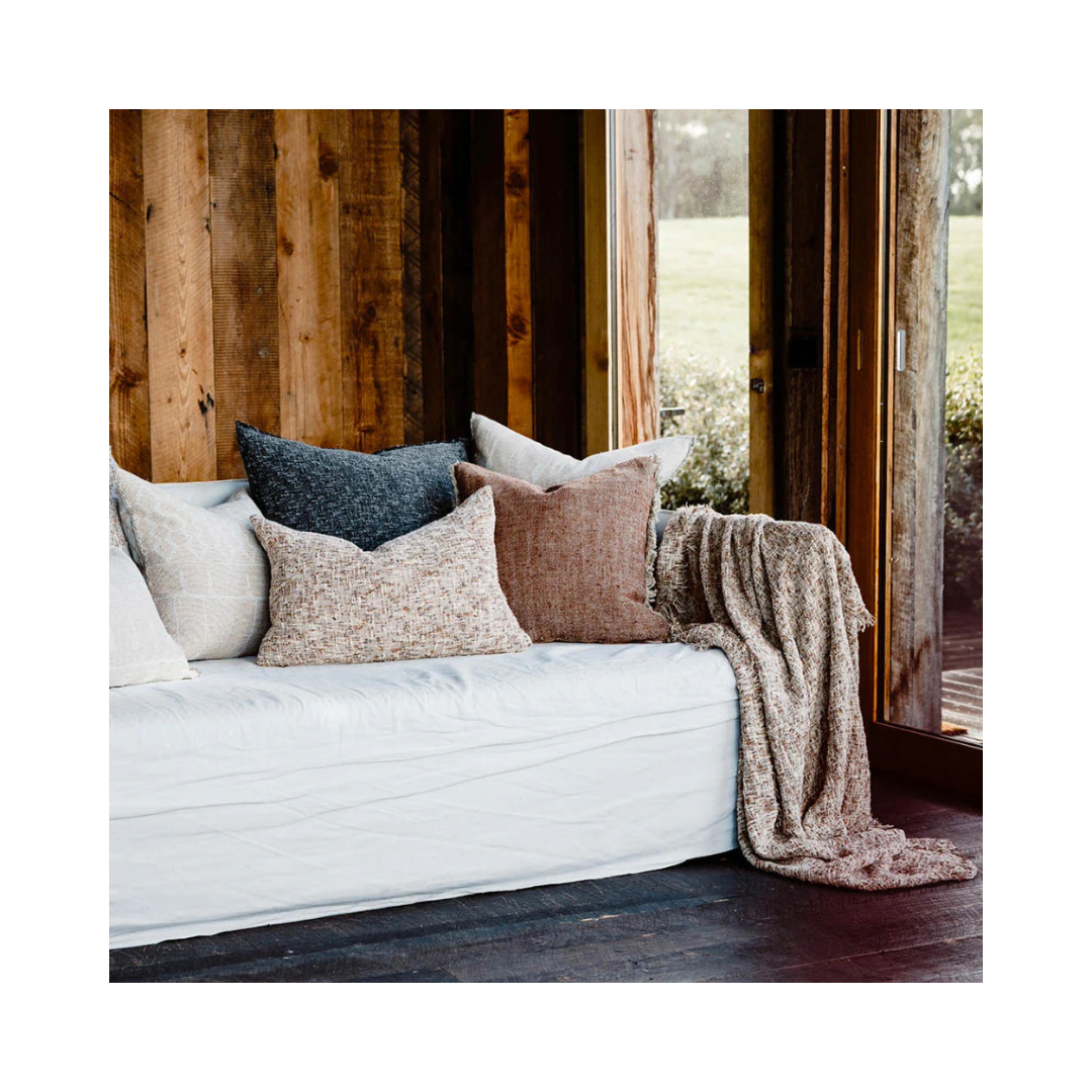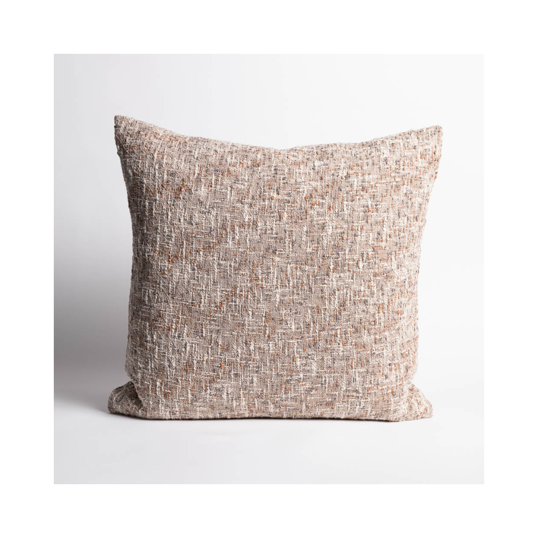 Ritchi-kudden kombinerar tre harmoniska garnfärger – mjuk lera, midnatt och benvitt – vävda till en rikt texturerad slubväv. Dess taktila känsla och subtila färgblandning ger djup och värme till alla utrymmen, vilket framkallar komfort och stil.