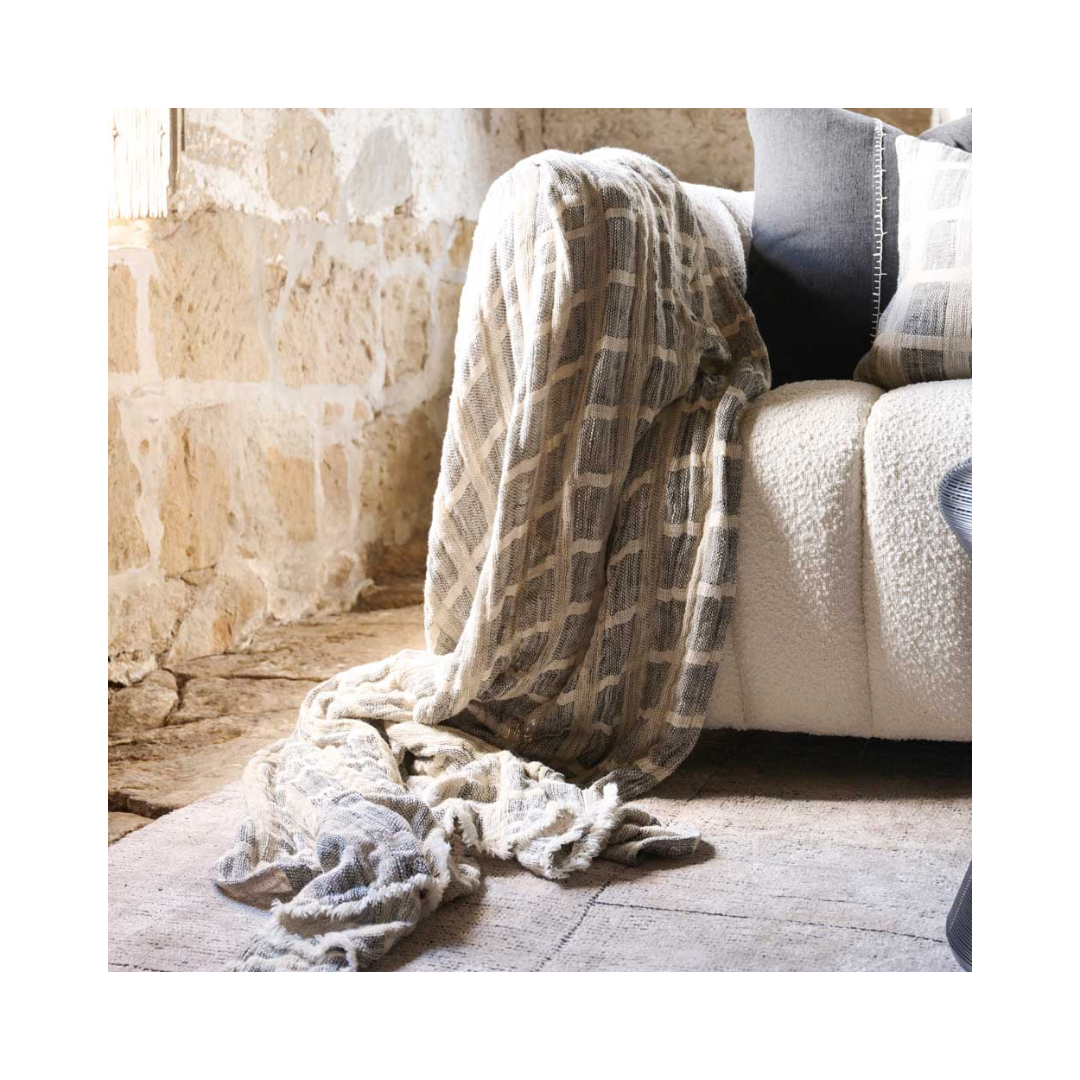 Wabi finns i elfenben, naturfärgat och svart på kuddar och plädar.