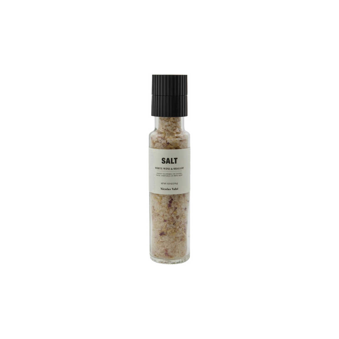 Salt White Wine & Shallot från Nicolas Vahé är en smaksatt saltblandning i kvarn där havssalt kombineras med vitt vin och schalottenlök. Resultatet är en balanserad och aromatisk kryddning med subtil syra och mild sötma.