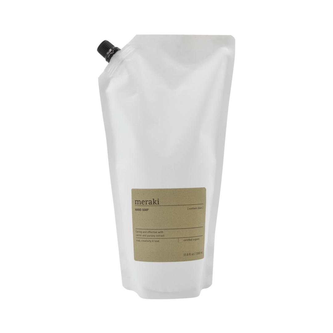 Meraki Hand Soap Refill – Northern Dawn är en praktisk 1-liters refillpåse med en certifierad ekologisk, flytande handtvål i den populära Northern Dawn-varianten. Genom att köpa denna refill kan du spara på förpackningen och fylla på din tomma pumpflaska 2 gånger. Själva väskan är gjord av återvinningsbar plast. Handtvålen passar alla hudtyper och kan användas dagligen för skonsam och effektiv handtvätt. Den är berikad med ekologiskt morotsextrakt som vårdar och ger fukt samtidigt som ett extrakt från persilja har en vårdande och renande effekt. Slutligen stärks hudbarriären av en fuktbevarande aktiv från sockerbetor. Sorten Northern Dawn innehåller toner av färsk apelsin, cederträ och söt balsamico.