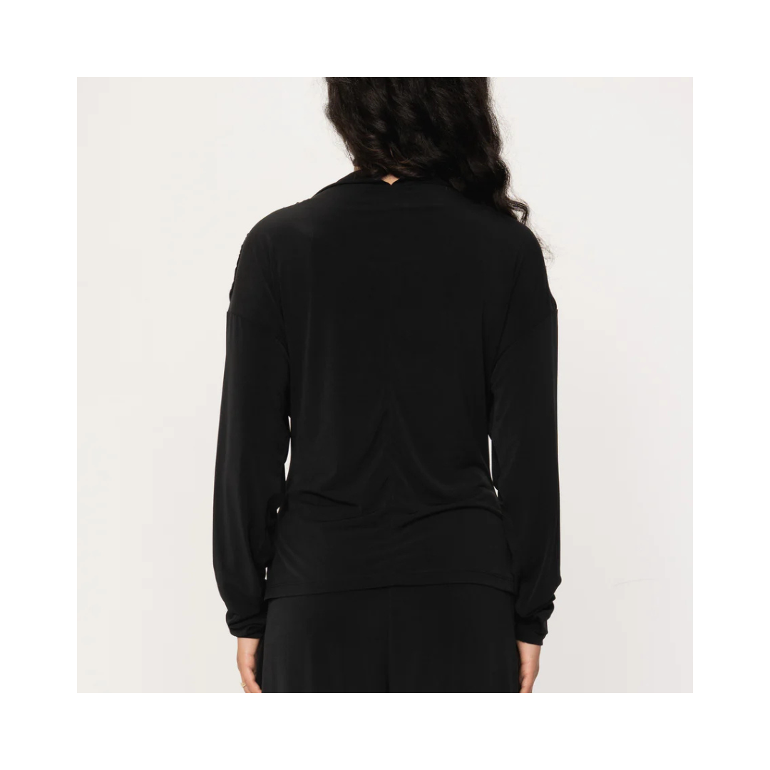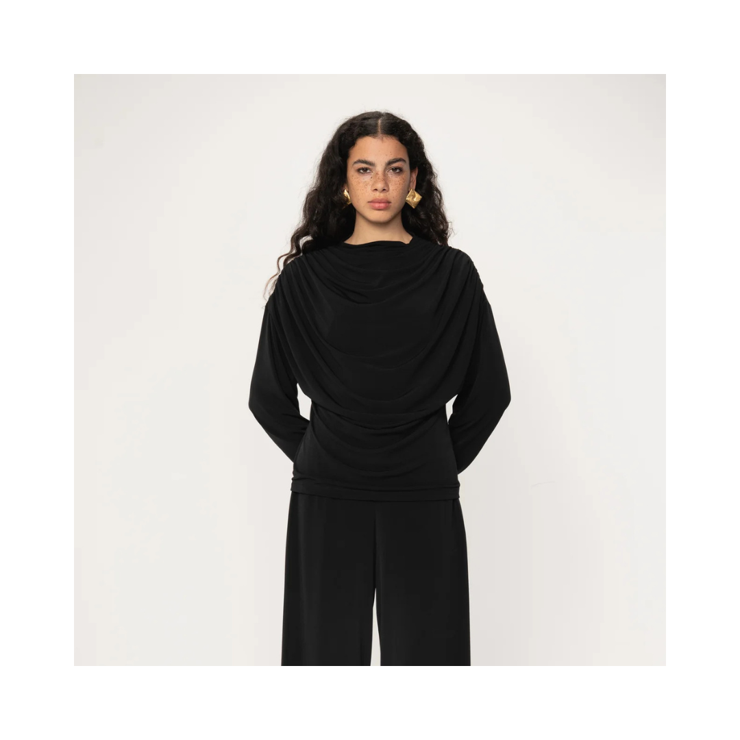 VIVEH signaturtopp Mirel är skuren i slät jersey med en mjukt draperad framsida som formar halsringningen och överkroppen, medan den nedre delen sitter snyggt mot kroppen. Genomtänkt designad för både avslappnad vardaglig elegans och tillfälligt bruk.
