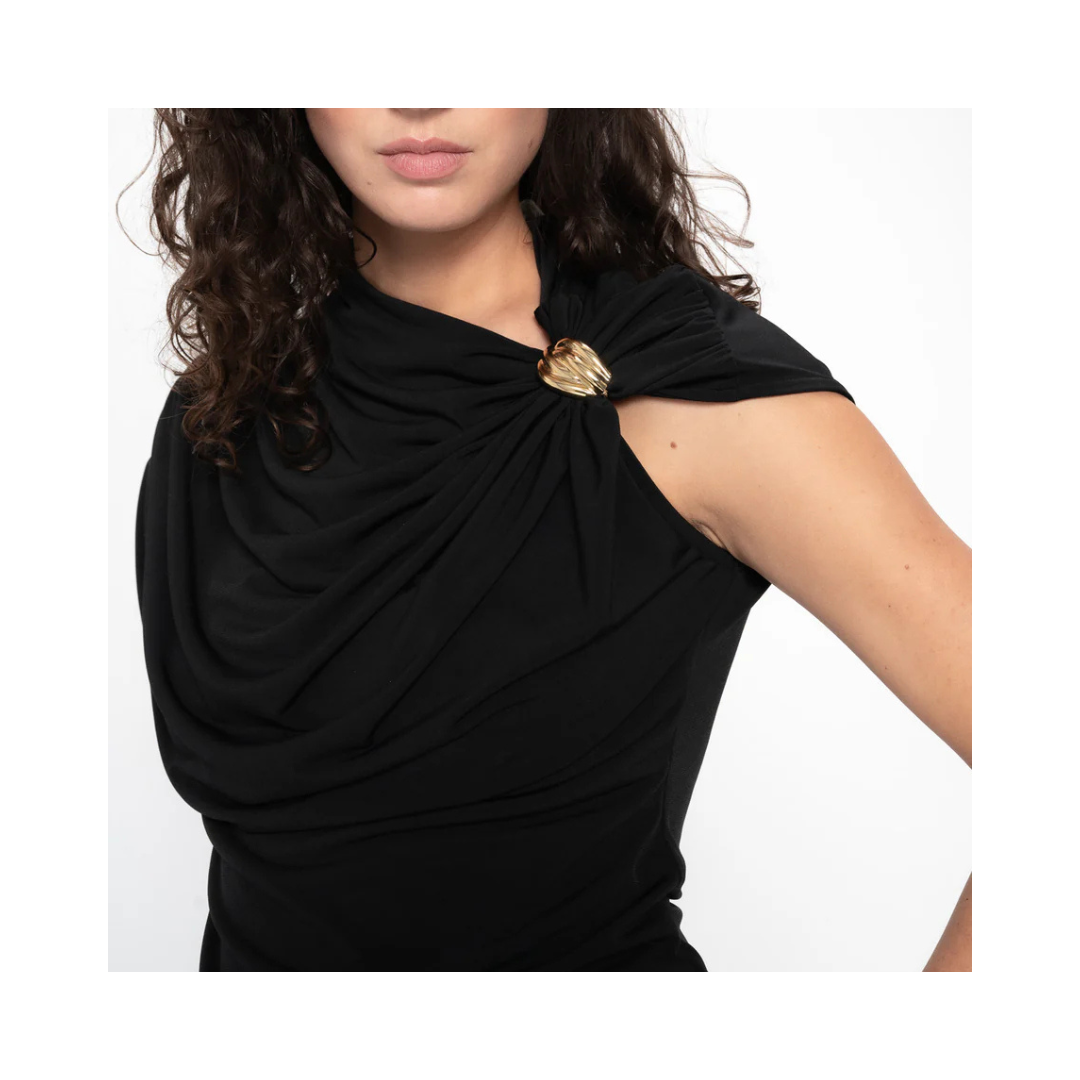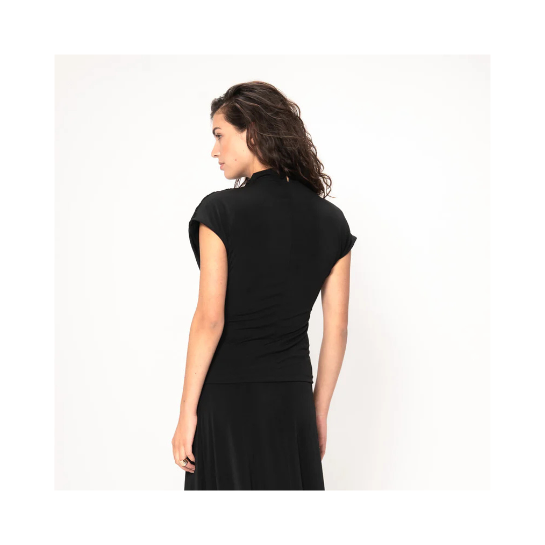 En ärmlös topp i slät jersey med mjukt draperad framsida som formar halsringningen och överkroppen, medan nederdelen sitter snyggt mot kroppen. Genomtänkt designad för både avslappnad vardaglig elegans och tillfälligt bruk.
